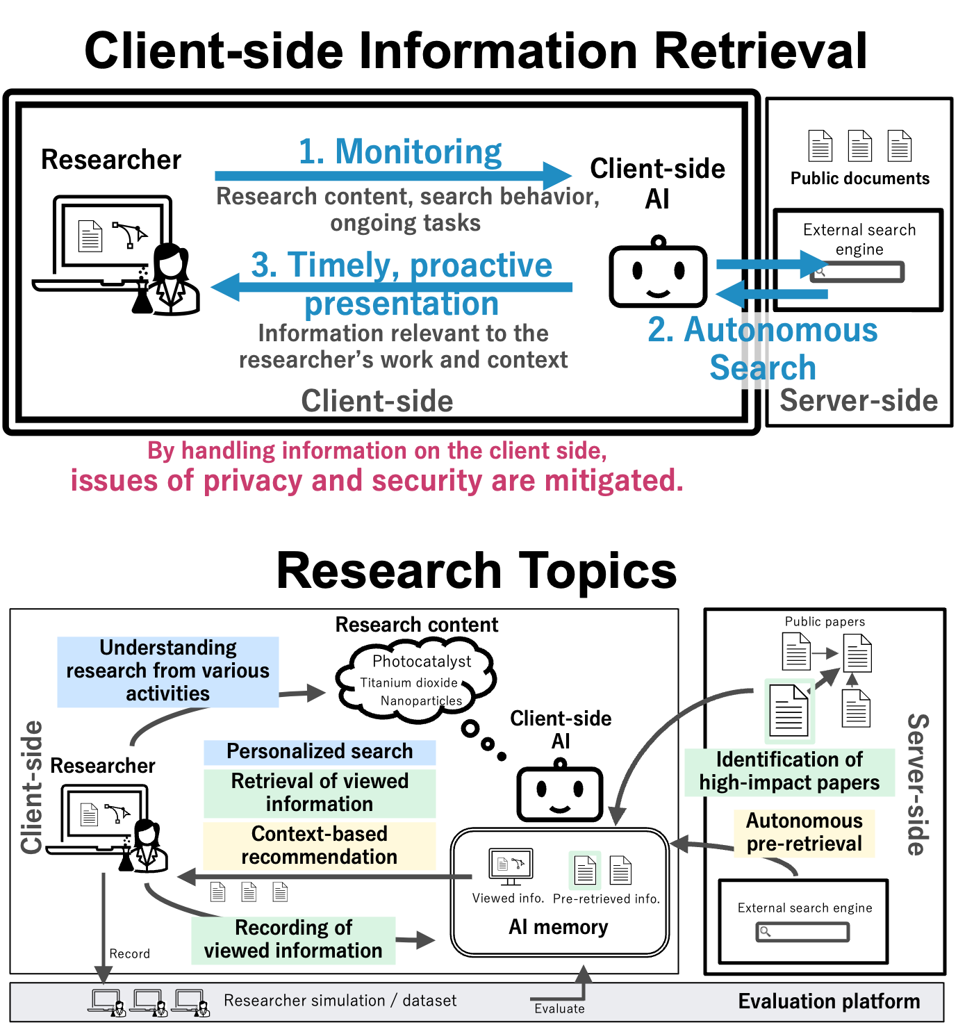 In this research project, we develop technologies that employ client-side AI running on researchers’ PCs to continuously monitor research activities and information-seeking behaviors, autonomously retrieving and providing information necessary for advancing research. This approach reduces privacy and security risks while enabling the timely delivery of information that researchers intend to search for, information they did not explicitly intend to search for but is still useful, and information that contributes to the progress of their research.
